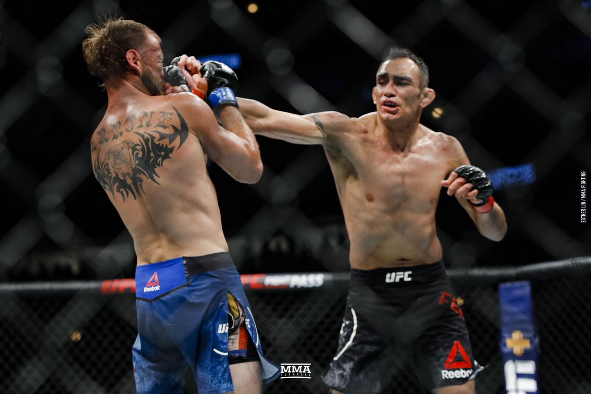 Tony Ferguson punches Donald Cerrone. Pic by MMA Fighting. Credit: Esther Lin