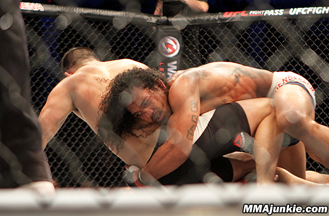 Benson Henderson (right) taking down Jorge Masvidal. Pic by MMAjunkie.com