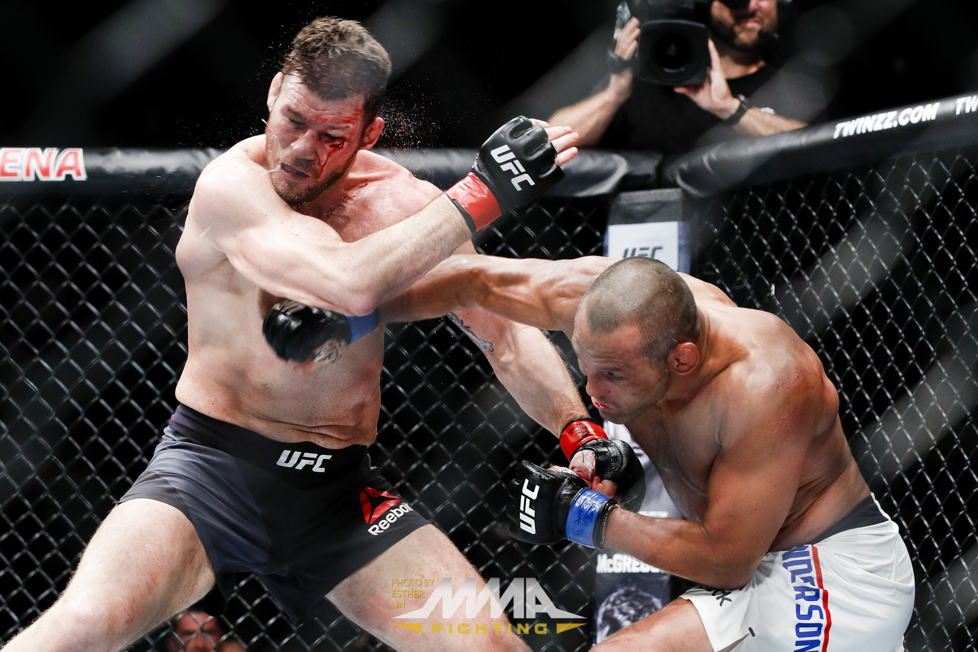 Michael Bisping (left) defended his title against Dan Henderson(right). Pic by MMA Fighting. Credit: Esther Lin