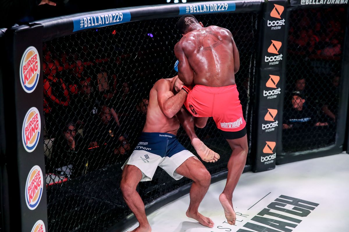 Lorenz Larkin (right) kneeing Andrey Koreshkov (left). Pic courtesy of Bellator MMA