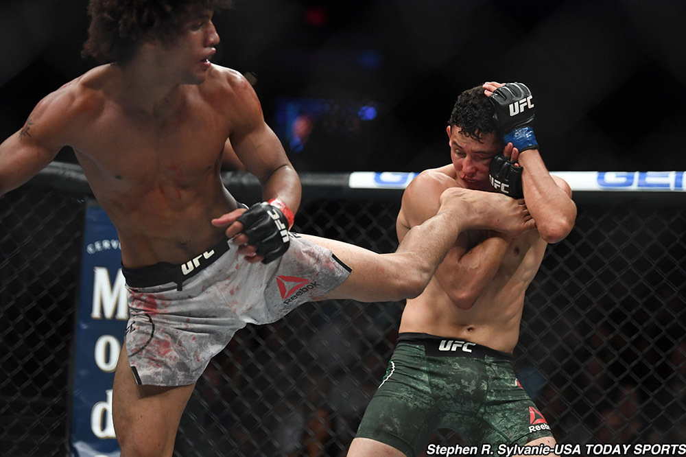 Alex Caceres kicks Martin Bravo. Credit: Stephen R. Sylvanie. Pic by USA TODAY Sports UFC Fight Night: Cannonier vs. Strickland – Alex Caceres