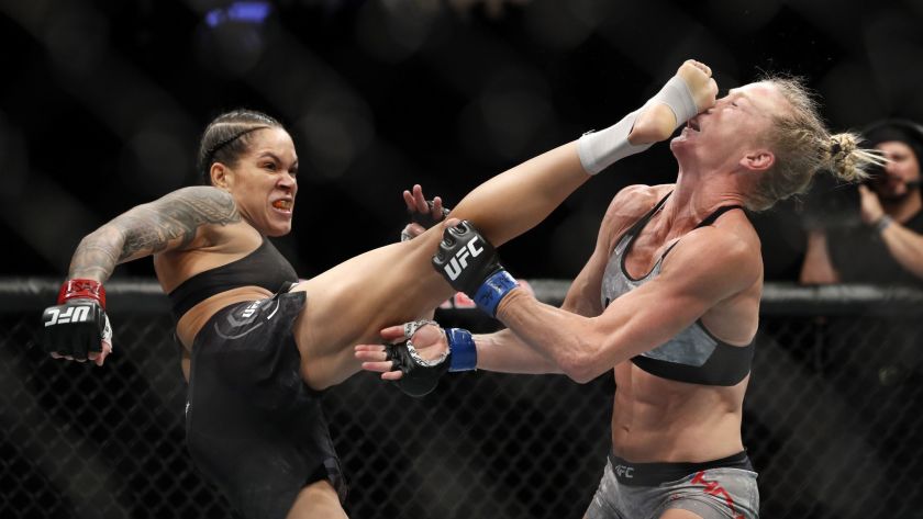 Amanda Nunes (left) kicks Holly Holm (right). Pic by Associated Press. Credit: Steven Marcus
