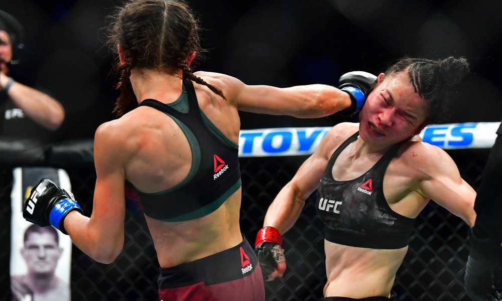 Weili Zhang (red gloves) fights Joanna Jedrzejczyk (blue gloves). Credit: Stephen R. Sylvanie-USA TODAY Sports