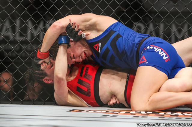 Sara McMann (top) fights Alexis Davis (bottom/red). Pic by USA TODAY Sports. Credit: Tracy Lee