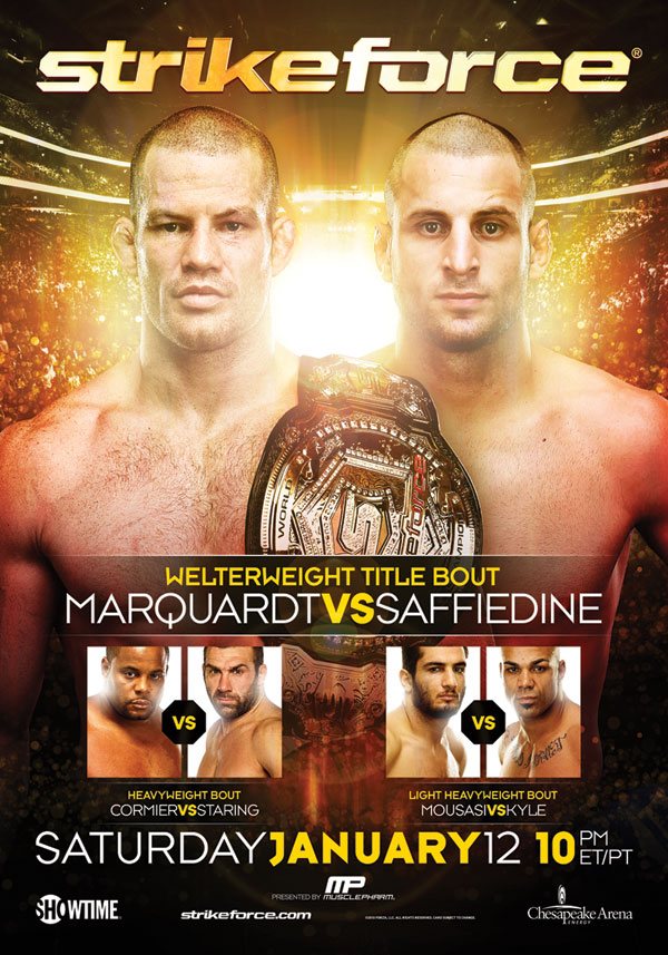 I will be reporting live updates on the event for MMA-Freak at approximately 9:00pm CST with play-by-play and live results of Strikeforce Marquardt vs. Saffiedine.