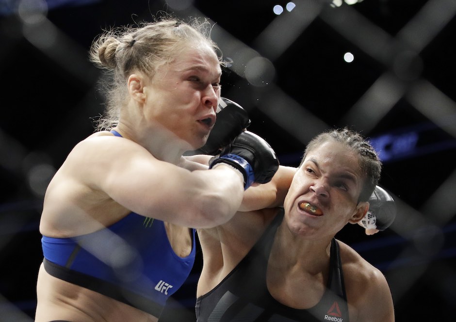 Amanda Nunes (right) punching Ronda Rousey (left) (AP Photo/John Locher)