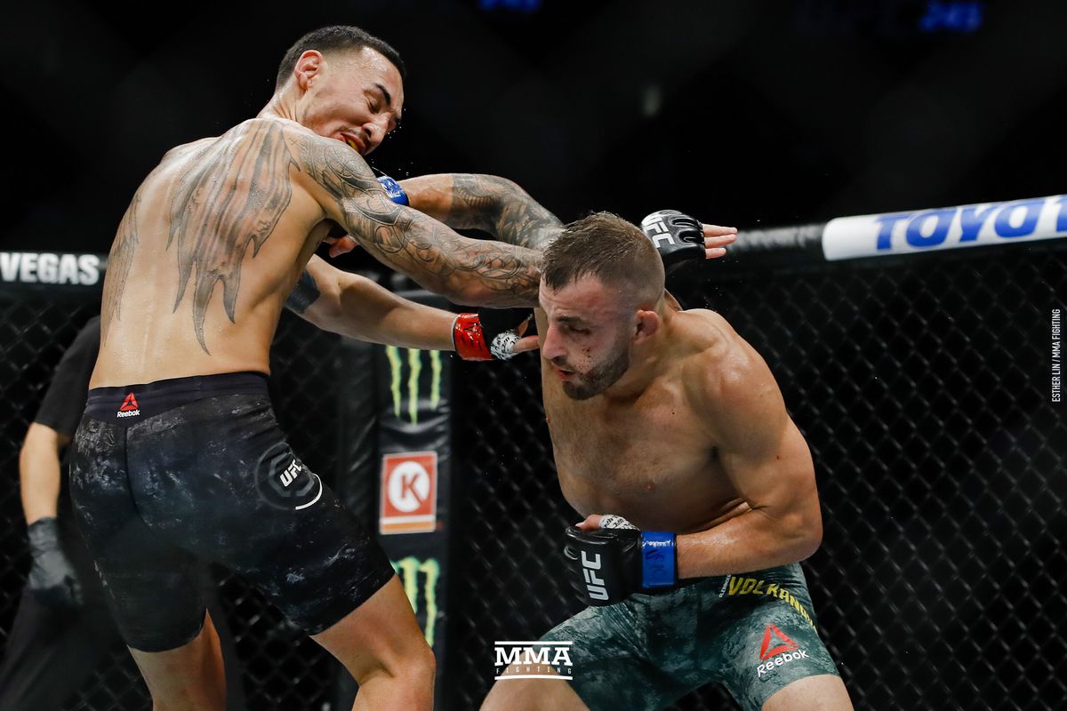 Alexander Volkanovski (right) punching Max Holloway (left). Pic by MMA Fighting. Credit: Esther Lin