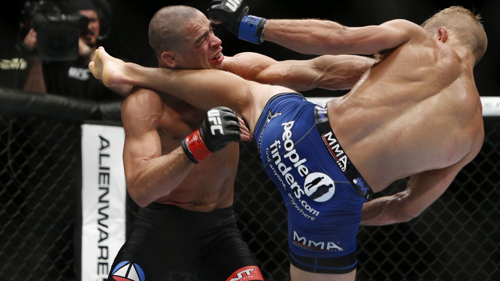 TJ Dillashaw (right) kicking Renan Barao. Pic by MMA Fighting. Credit: Esther Lin