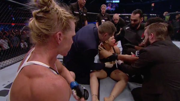 Then the fight happened. In an attempt to add insult to injury, Ronda refused to touch gloves with Holm after referee Herb Dean’s said they could do so. Soon thought the tables were turned, Ronda seemed all over the place, and she ended up chasing Holm around the ring. While Holm was able to land powerful jabs and even defending against Ronda’s sole armbar submission attempt.